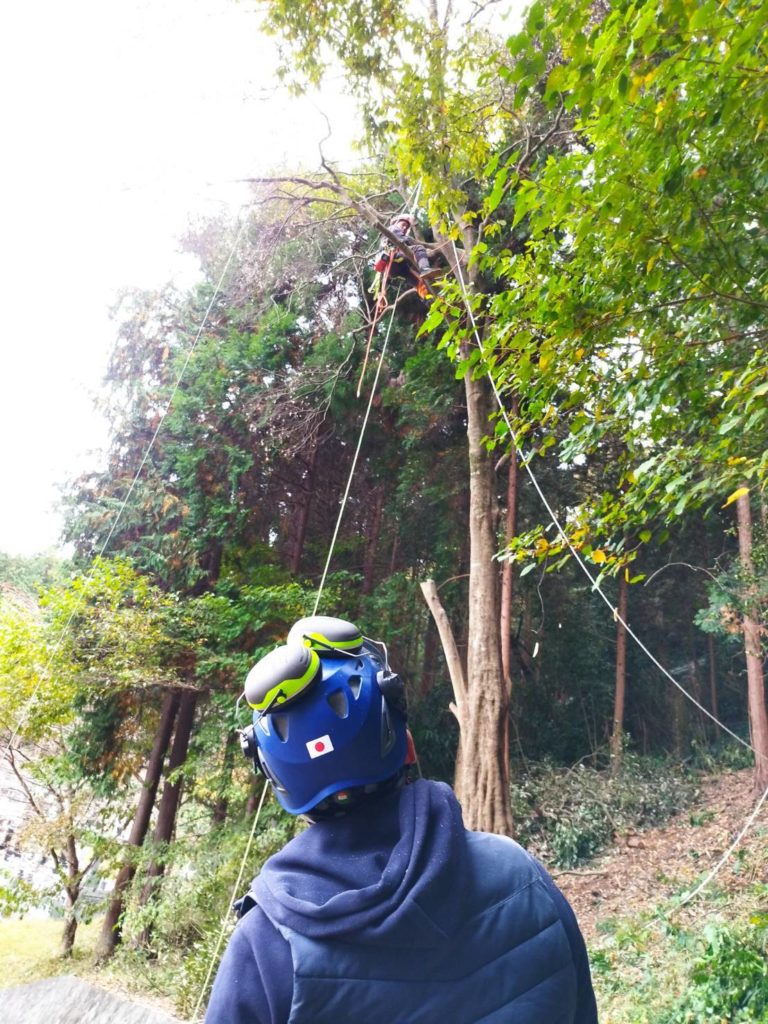 グラウンドワーカーとしっかりとディスカッションして手順やリスクを確認して、安全を確認しながあ少しずつ枝を下ろしていき、無理なく倒せる高さにしてから、エンジンウインチにて上方に牽引して精密に伐倒しました。