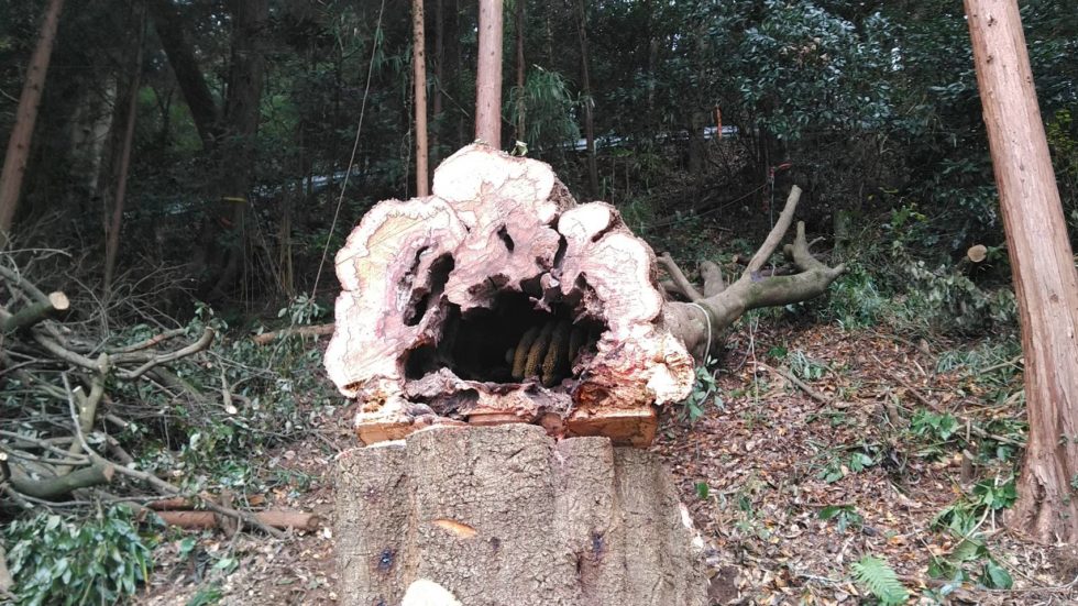 伐り倒してみると内部が空洞化していて、中には古いミツバチの巣までありました💦