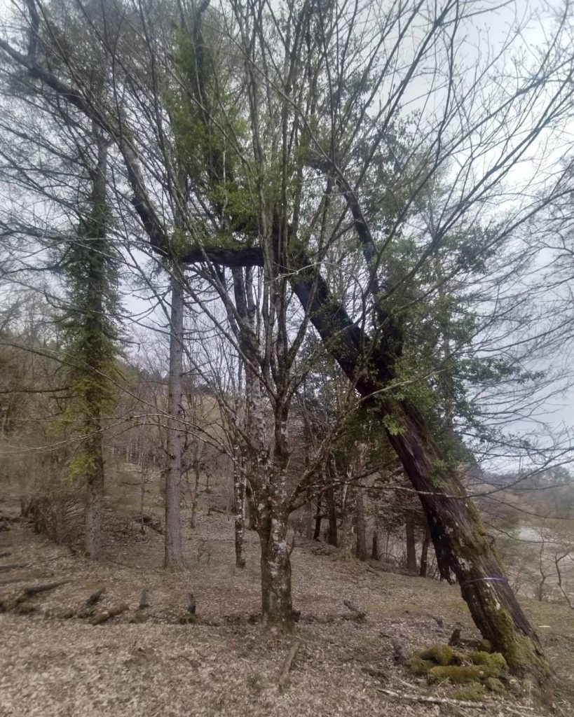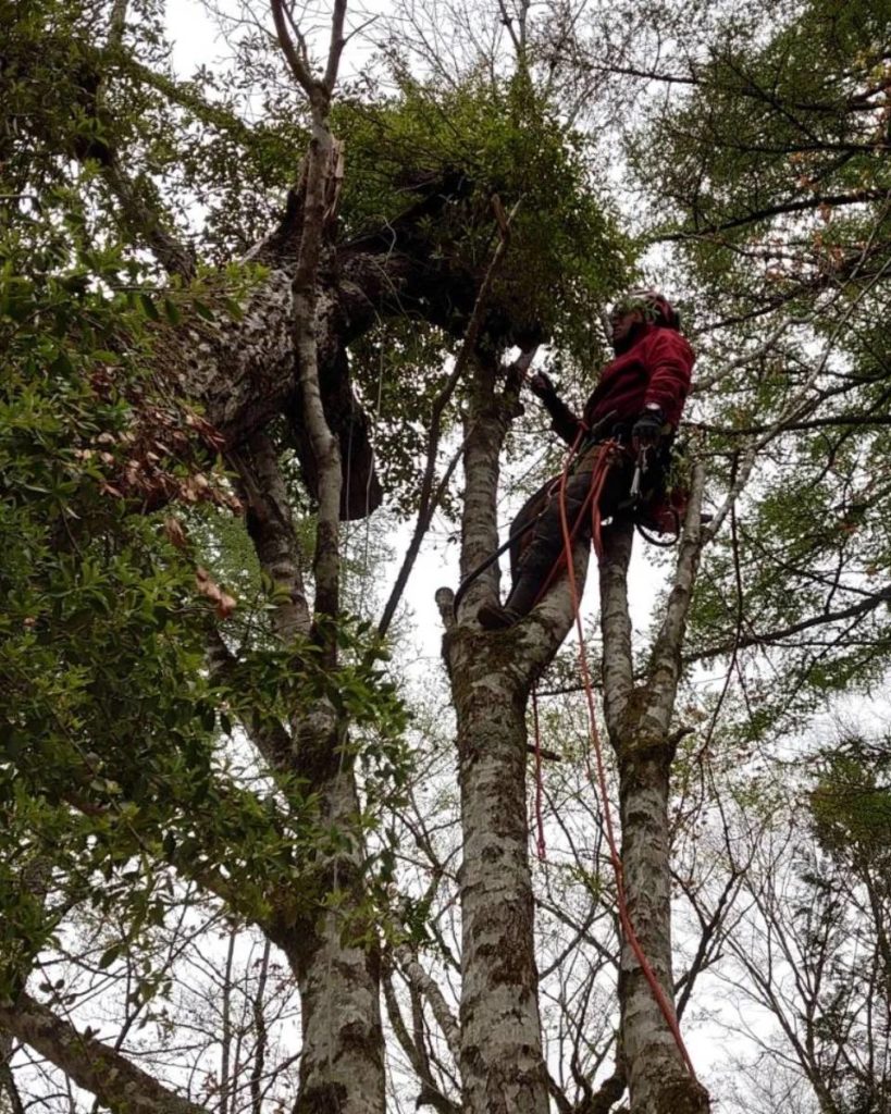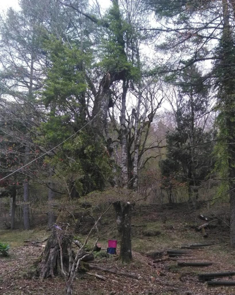 最後の一本は、かかり木になったまま朽ち果てている木で、伐採イメージがつかめずにいましたが、樹上へ登って枝を解除していくにつれ、安全精密な伐採方法が見えて来ました。