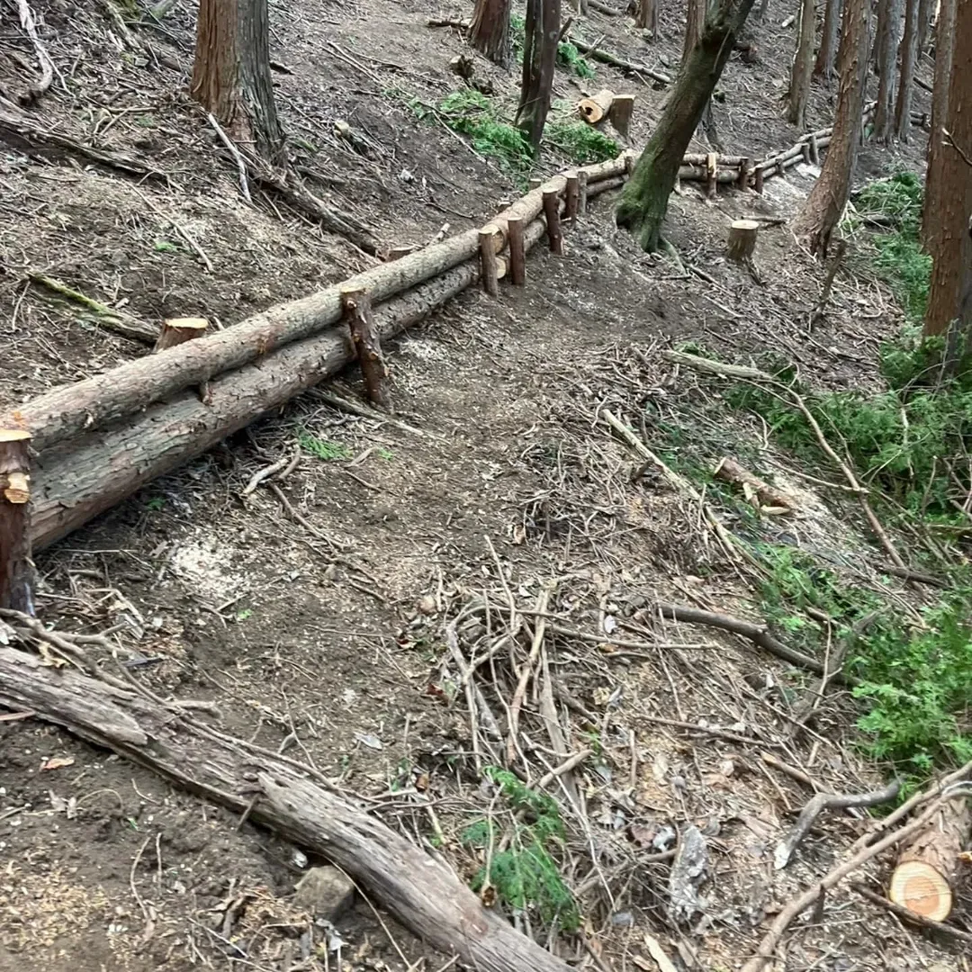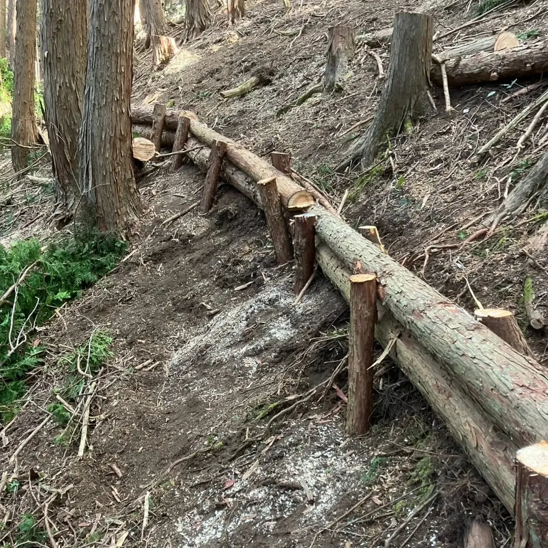 現地では間伐に加えて木柵づくりも実施。伐って終わりではなく、災害防止に役立つ整備もあわせてご提案しています。
